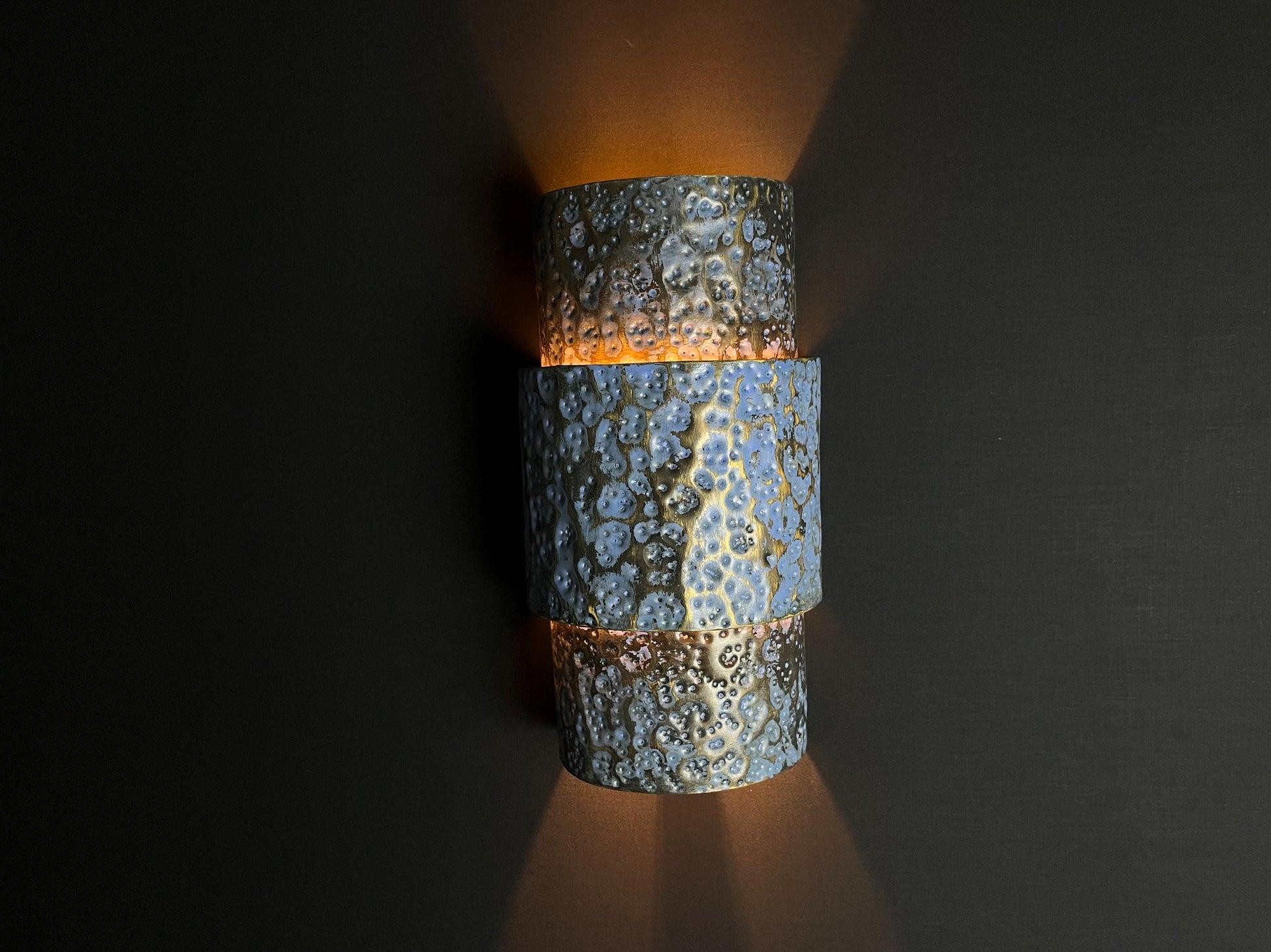 Blue Patina Brass Wall Sconce: Moroccan Hammered Cylinder Light