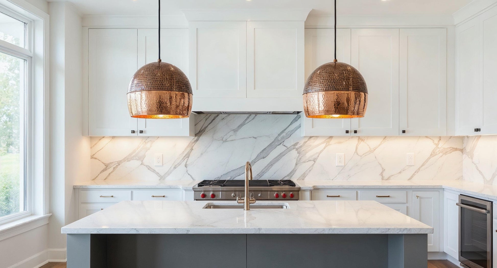 Elevate your kitchen or dining space with this stunning handmade hammered copper dome pendant lamp. Expertly crafted by Moroccan artisans, this large ceiling light features a warm golden inner glow and a sleek, modern silhouette, perfect for kitchens, dining areas, or over a kitchen island.
