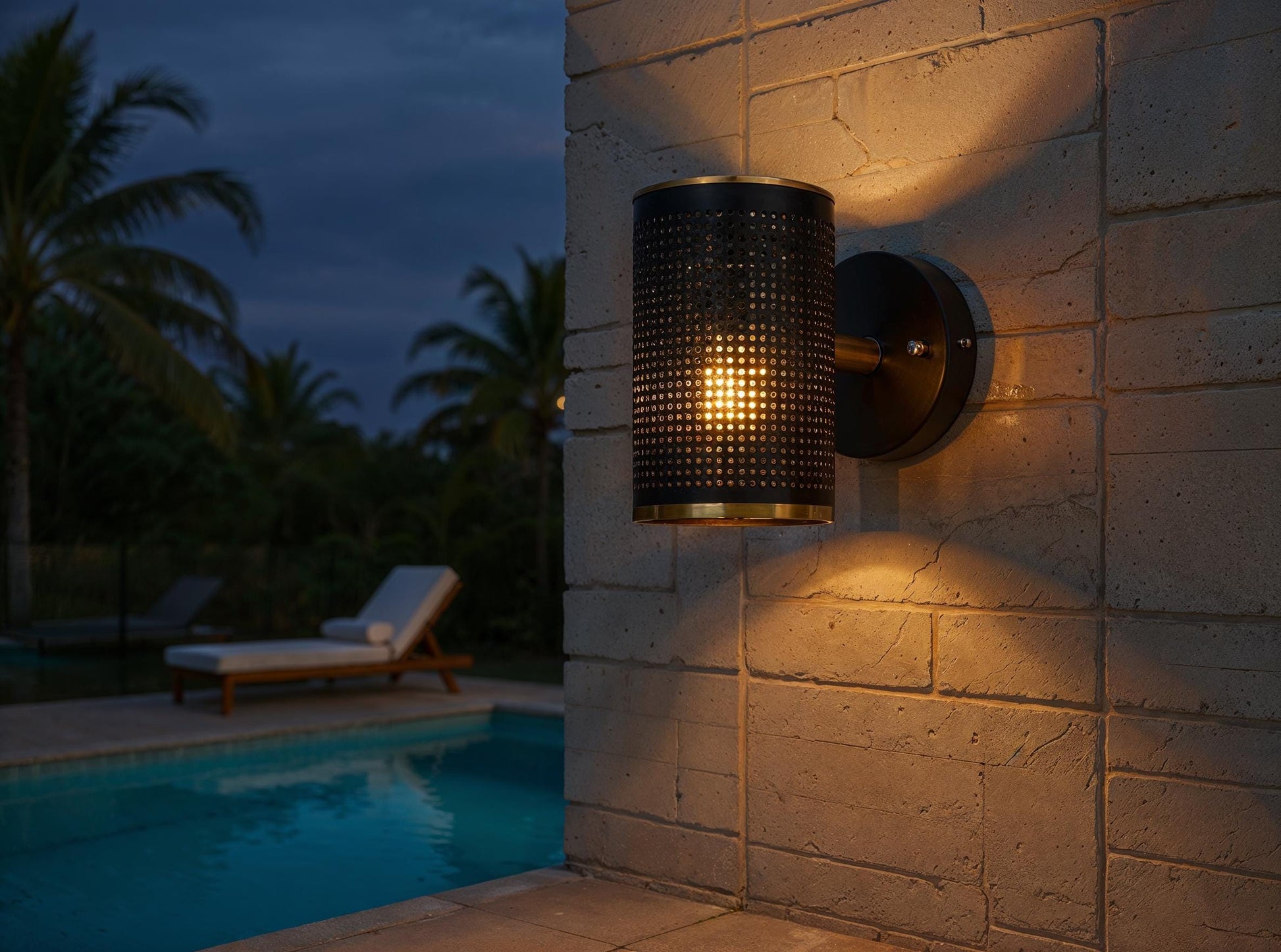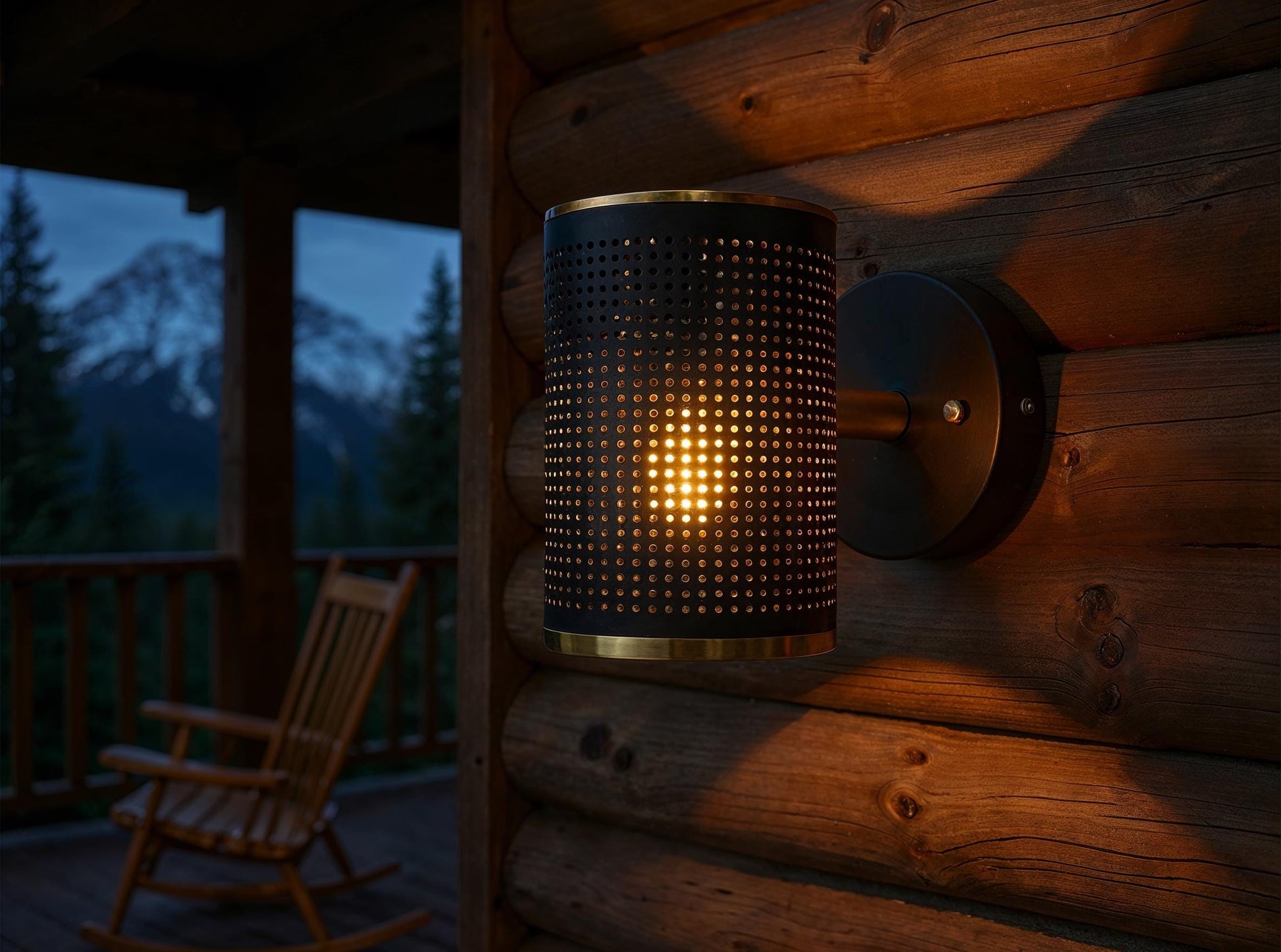 Modern Black and Brass Wall Light – Perforated Cylinder Sconce – Industrial Mid-Century Wall Lamp for Living Room, Hallway, or Bedroom