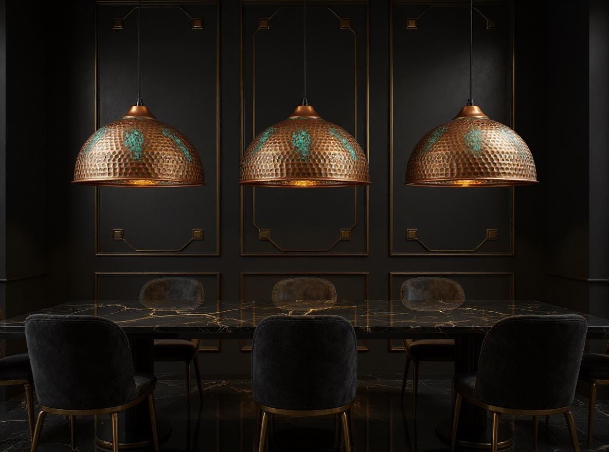 Perfect for kitchen islands, dining areas, or loft interiors, the rich copper exterior showcases a warm glow while the subtle hammered texture adds artisanal charm. Its timeless design makes it a stunning centerpiece in both rustic and contemporary spaces.