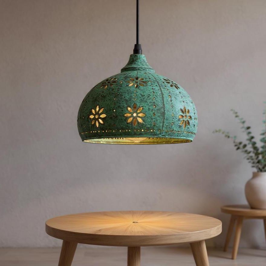 Illuminate your home with the enchanting charm of Moroccan craftsmanship. This handmade green patina brass pendant lamp features exquisite floral cut-out patterns that project mesmerizing shadows and a warm, inviting glow — turning any space into a cozy, art-inspired haven.