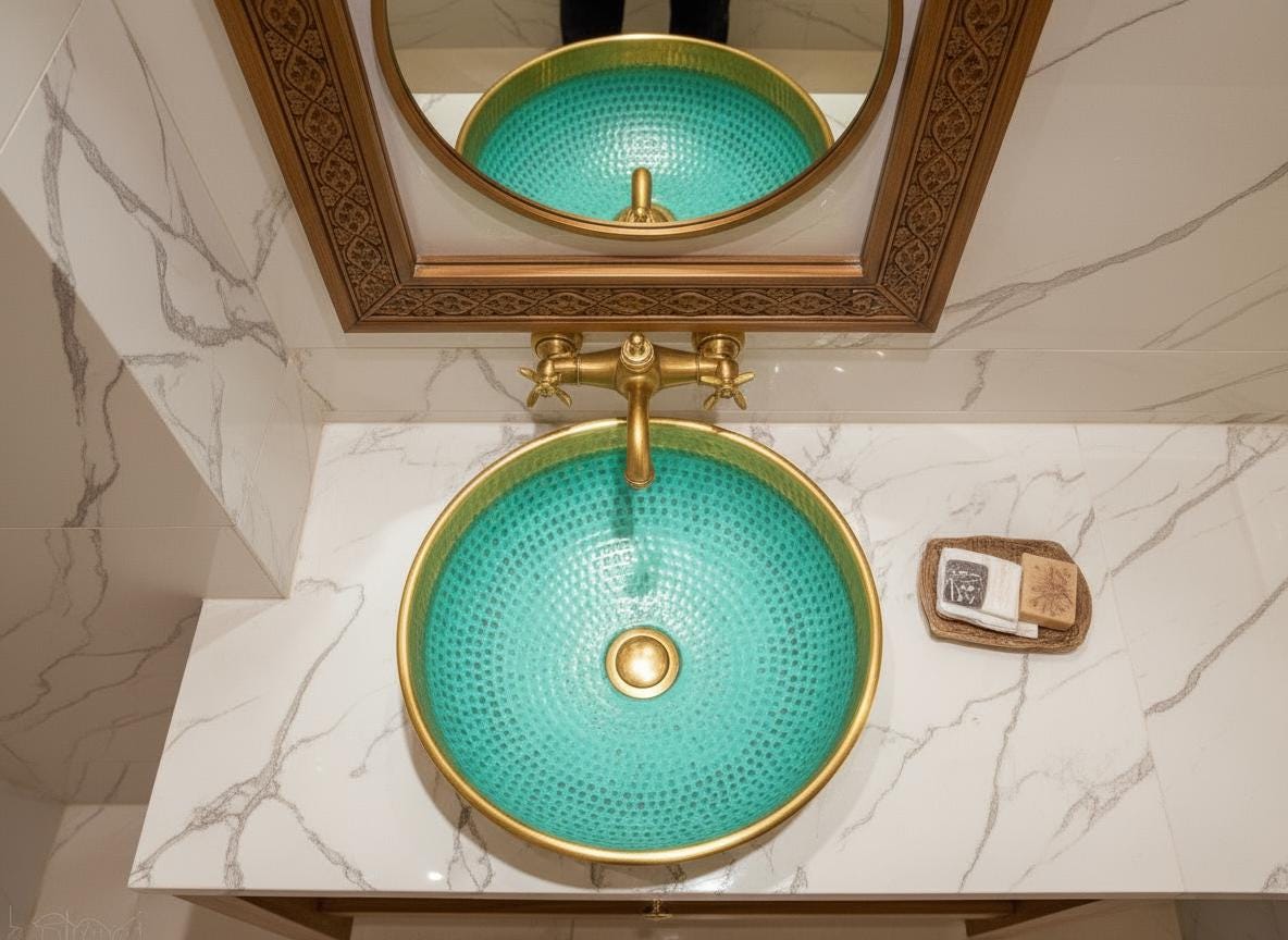 Elevate your bathroom with the timeless beauty of this handmade Moroccan brass sink, featuring a rich green patina and a luxurious gold rim. Expertly crafted by skilled artisans in Marrakech, this vessel basin combines traditional metalwork with modern elegance β a true statement of Moroccan artistry.