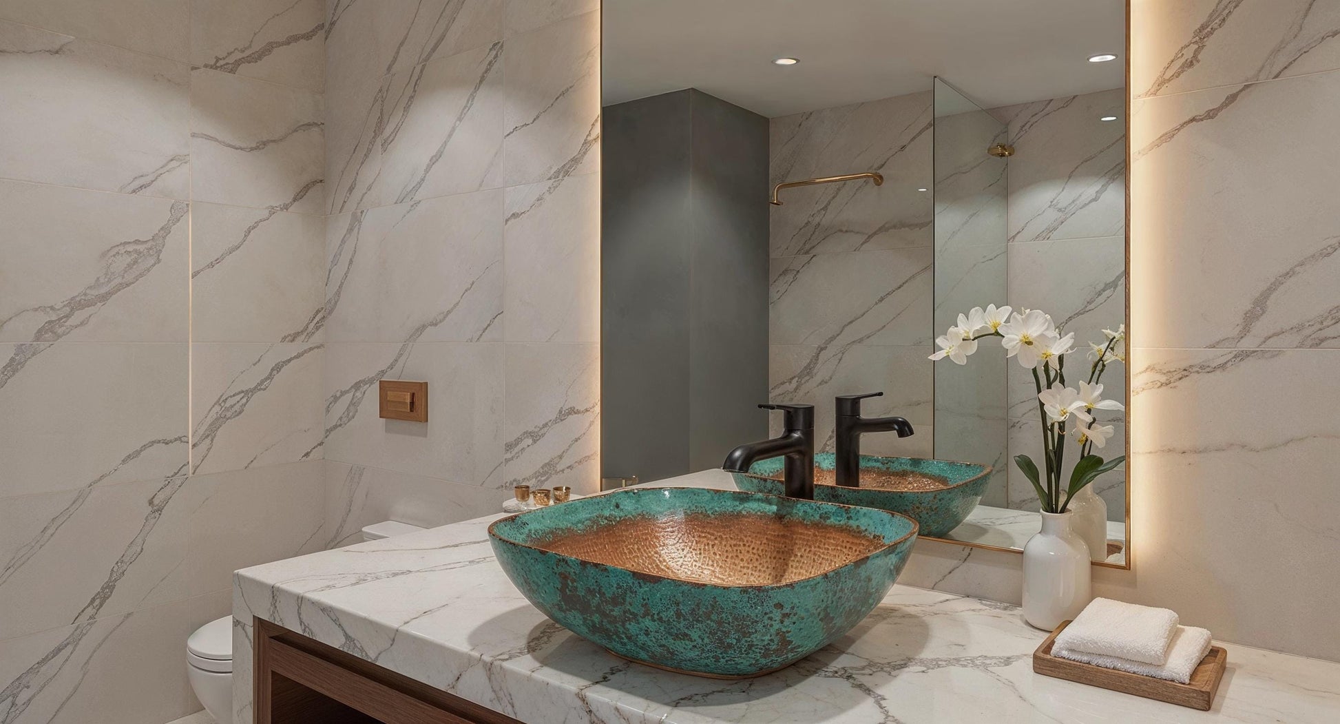 Each sink is individually handmade by skilled artisans, ensuring every piece has its own distinct character. The natural patina process creates a beautiful, aged look that evolves over time, making your bathroom truly one-of-a-kind.
