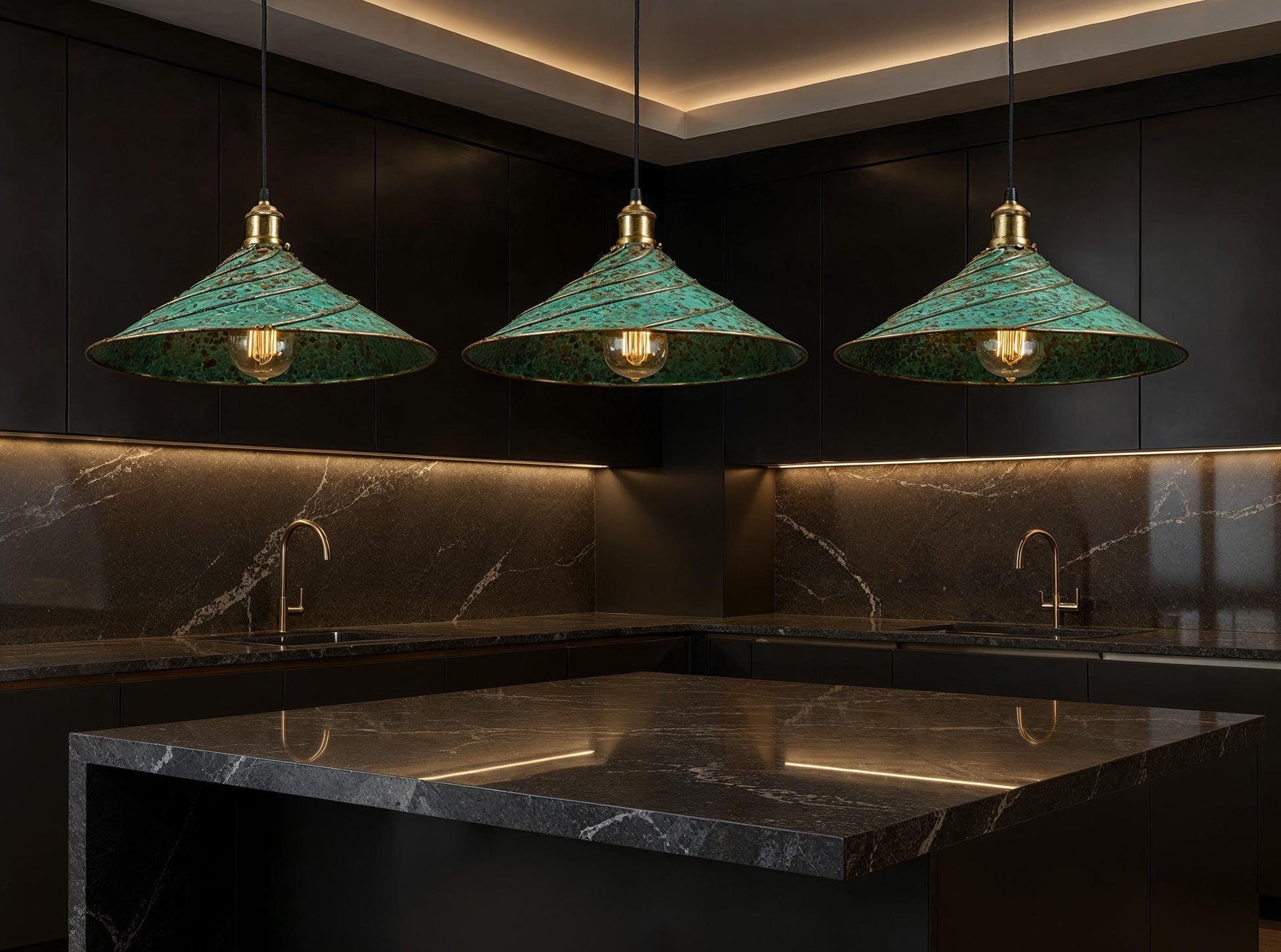 Elevate your home with this handcrafted green patina copper dome pendant light, expertly made by Moroccan artisans using traditional martelé hammering techniques. The two-tone finish features a rich green patina exterior with a polished gold interior, creating a warm, inviting glow. Perfect for kitchens, dining rooms, or over a kitchen island, this pendant light blends modern rustic style with timeless craftsmanship.
