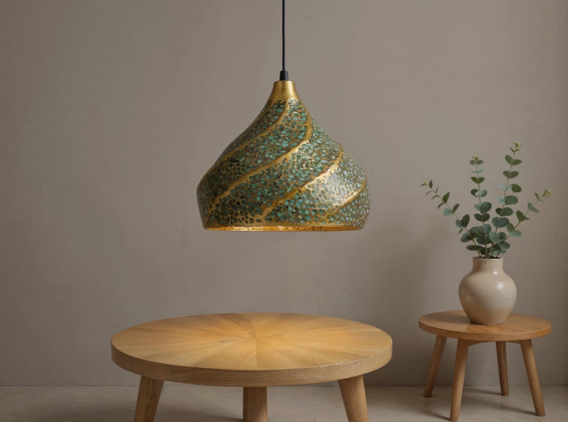 Handmade Moroccan Hammered Copper Pendant Light with Green Patina – Spiral Dome Chandelier, Rustic Farmhouse & Boho Lighting Fixture