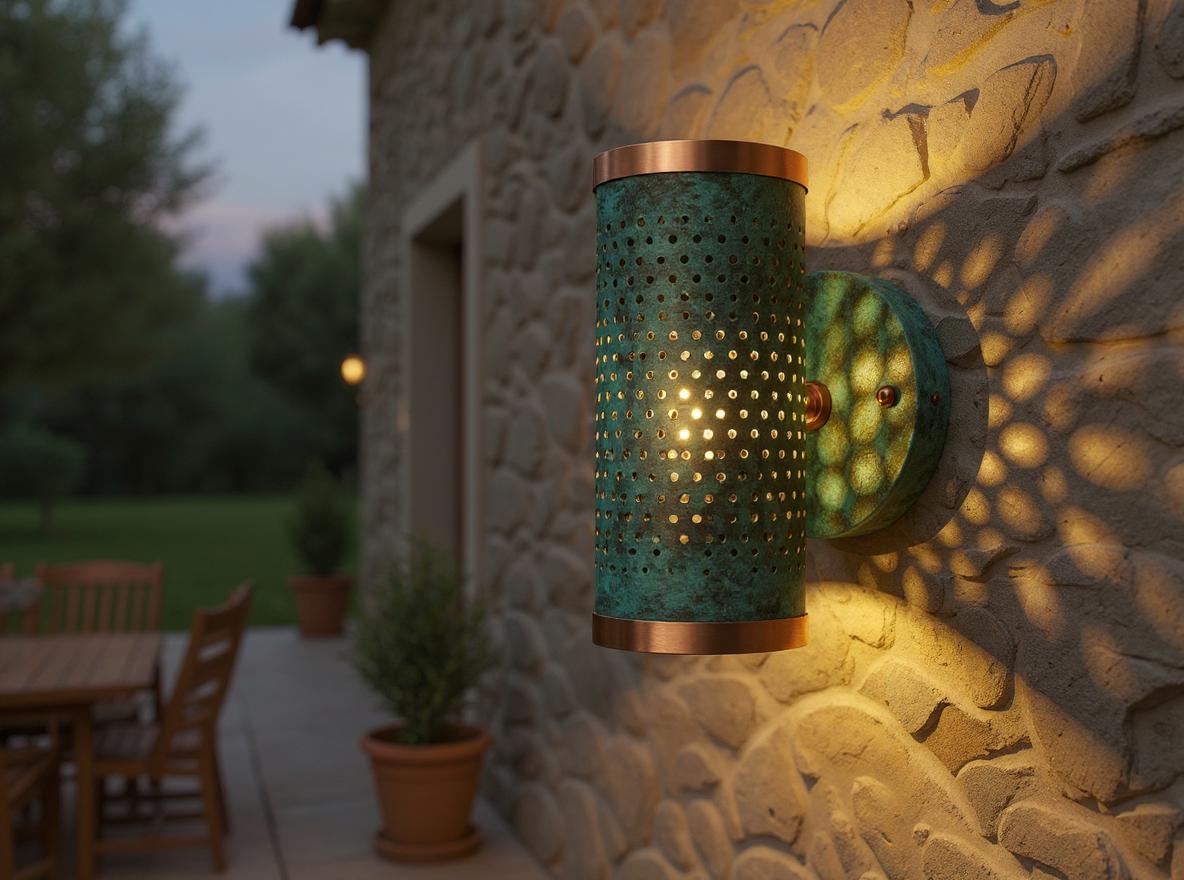 Rustic Patina Wall Light – Handmade Brass Outdoor Sconce with Perforated Design – Vintage Industrial Cylinder Lamp for Porch & Patio
