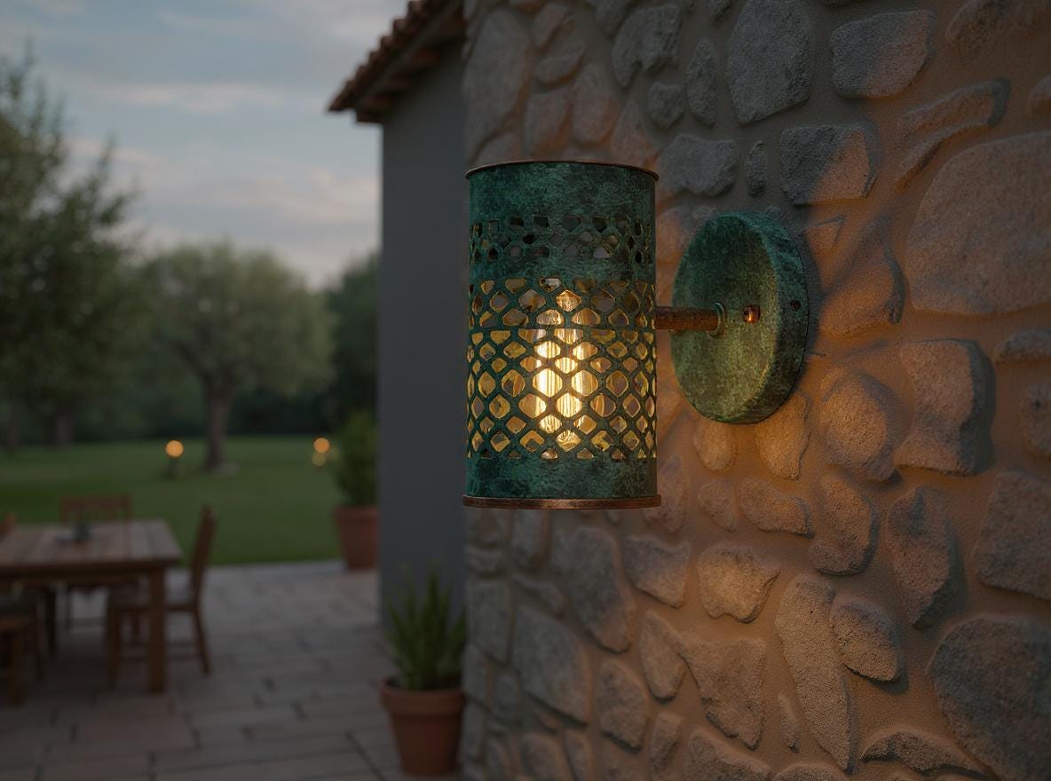 Rustic Patina Wall Light – Handmade Brass Outdoor Sconce with Perforated Design – Vintage Industrial Cylinder Lamp for Porch & Patio