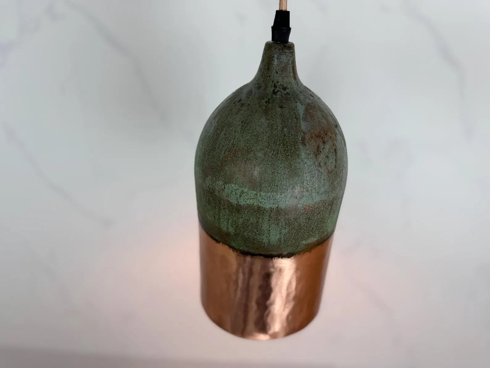 Élevez votre espace avec notre superbe suspension en cuivre fabriquée à la main avec une belle finition patinée verte qui ajoute du caractère et un charme vintage à n'importe quelle pièce. Chaque lampe est fabriquée individuellement avec une attention méticuleuse aux détails, garantissant une pièce unique qui raconte une histoire.