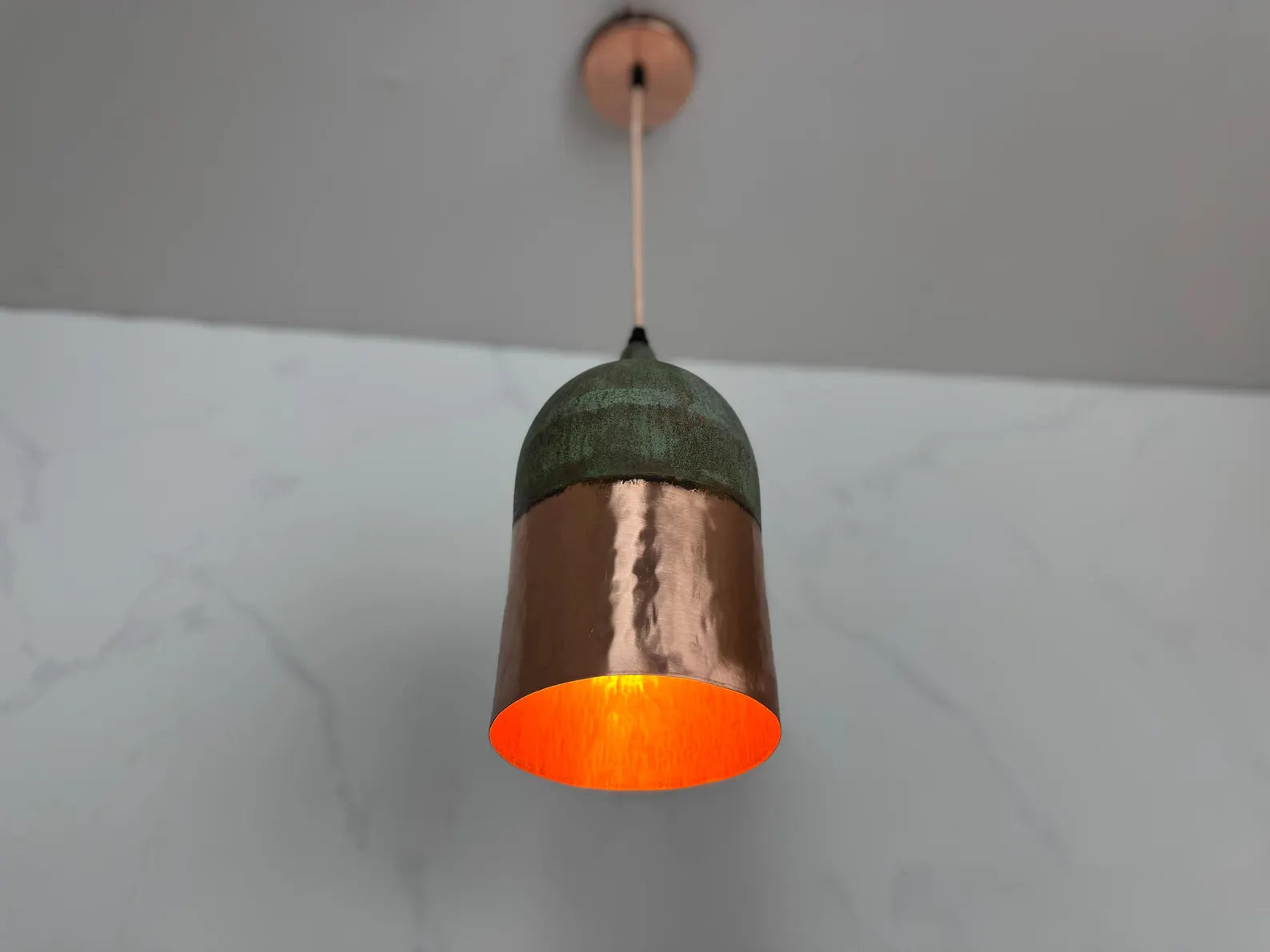 Le contraste entre l'extérieur patiné vert vieilli et l'intérieur chaud en cuivre crée un effet visuel époustouflant lorsqu'il est illuminé. Parfaite décoration au-dessus des îlots de cuisine, des tables à manger, des tables de chevet ou disposées en grappes pour un effet spectaculaire.